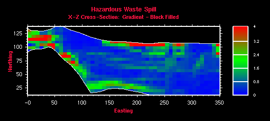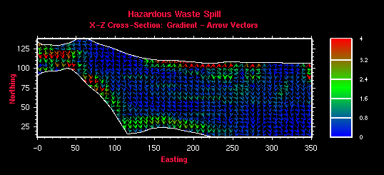 Figure 11.10a,b,c: In addition to displaying contour information, slope gradient information can also be displayed. The gradient information can be displayed in three slightly different ways: 1) color filled grid cell with no directional information, 2) color coded gradient vector, and 3) color coded and variable length gradient vector.