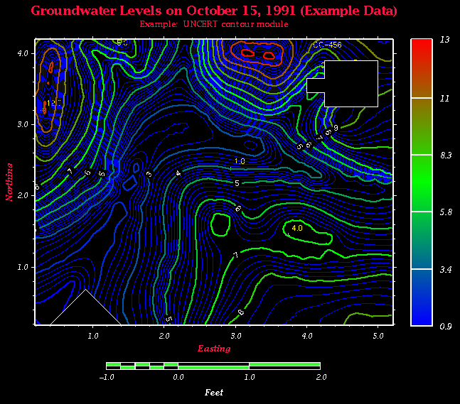 Figure 11.3: This contour map shows several features of contour (file dig.grd). The map was printed with a portrait orientation using blanking and data posting options. Contour lines of variable weight are available, a grid may be overlain, surficial features such as building outlines (rectangular whited-out areas) may be positioned, and the location of important points (assay values, well ID's, etc.) can be identified.