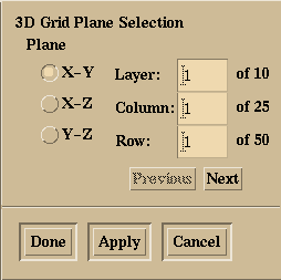 Figure 11.6: 3D Grid Plane Selection pop-up dialog. With three-dimensional data sets this dialog allows the user to determine what plane (X-Y, X-Z, or Y-Z ) of the grid will be plotted and contoured.
