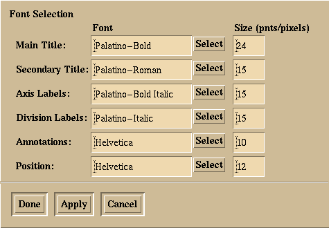 Figure 5.10: Font Selection pop-up dialog. This dialog is used to define the X-windows and Postscript text fonts and font sizes for different portions of the graph.