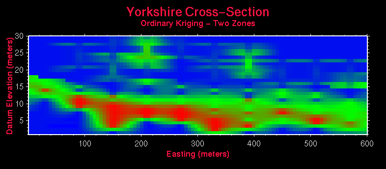 Figure 10.13a,b: These two figures demonstrate how using multiple zones can effect the grid solution. In a) a single semivariogram model was used with a range of about 150m. In b) a short range (50m) has used in the upper portion of the cross- section, and 300m has used in the lower section. In b) the continuous nature of the lower portion of the actual site and the discontinuous nature of the upper section is well captured. The vertical features on the figures are the well locations.