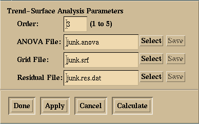 Figure 10.17: Trend-Surface Analysis pop-up dialog. This dialog is used to set parameters used by the inverse-distance gridding algorithm. These include search distance, tolerance, power, number of nearest neighbors to use in the search and the search pattern. The grid output filename may also be entered, and saved using this dialog.