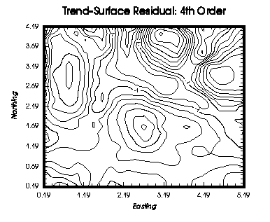 Figure 10.26a,b:These maps show the fourth order trend-surface (a.) and the residual map (b.) for the data set water.dat.