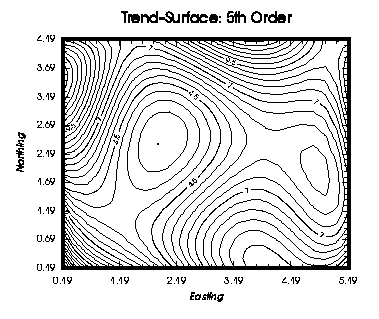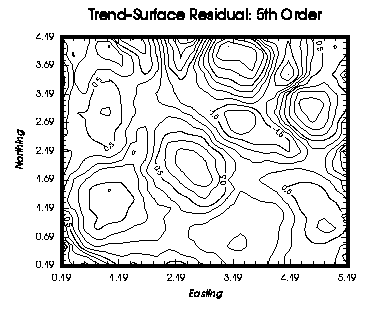 Figure 10.27a,b:These maps show the fifth order trend-surface (a.) and the residual map (b.) for the data set water.dat.