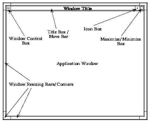 Figure 3.1: X-windows/Motif application window components. Besides the controls of a program application itself, the window manager allows the user to customize several aspects of the application interactively. Using window components, the window can be resized, moved, iconized, and destroyed.