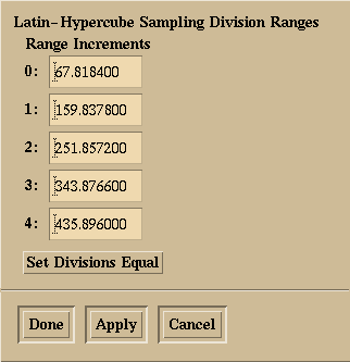 Figure 9.13a,b,c: Sampling Division Range pop-up-dialogs. These dialogs are examples of dialog used for specifying the range increments for Range, Variance, and Nugget for the Latin-Hypercube Sampling model fitting algorithm.
