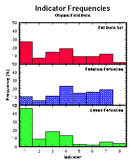 Fountain Formation: Data in this subset tends to favor indicators #4 though #7. Lyons Formation: Data in this subset tends to favor indicators #1 though #4. Indicators #5 and #6 are very poorly represented, and indicator #8 occurs almost exclusively in this zone. |