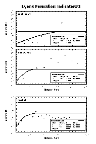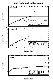 For this case study, the data was divided into eight indicators. For each indicator, experimental and model semivariograms were calculated for the principle and two minor axes. This was done for the full data set and for each formation. The results for indicator #3 are shown here. Of the different indicators, they best show that the spatial statistics indeed are different, though all indicator sets showed this fact to some extent. The top row of semivariograms is for the North-South direction, the middle row is East-West, and the bottom row is vertical.