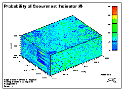 From the maps, it can be seen that the single zone realizations do not identify any transition of indicator frequencies accross the site. The distributions are relatively constant. With the two zone realizations, though, there are very distinct differences. Because there is such a high frequency of indicator #1 in the Lyons formation, most cells have a relatively high probability of being indicator #1. For indicator #5, which was quite rare in the Lyons Formation, its probability of occurrence is also low.