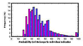 | Here, using two zones (blue) there are fewer low probability cells, more mid-probability cells, and about the same number of high probability cells. This implies that there is less uncertainty in the two zone models which suggests the results are better. |