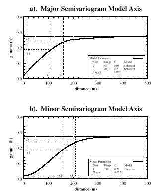 It is often difficult to fit a model semivariogram to both the principle-axis and the minor-axes using traditional methods with anisotropy ratios. Traditionally, models (possibly nested) are modified with anisotropy factors; these represent the relative range of the semivariogram for three orthogonal axes. This technique is restrictive, and this discussion presents a method for relieving this limitation by defining different semivariogram models, independently for each axis. These are referred to as directional semivariograms. The process increases the kriging processing time by 80% to 200%, but the method offers the modeler greater flexibility, and simulation or estimation results that are more representative of the site, because the spatial variation of the data can be more precisely defined.