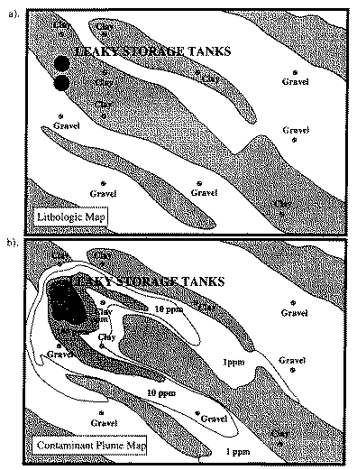 Figure 1.4: For a different interpretation of the subsurface the resultant contaminant plume is distinctly different than the one shown in Figure 1.3, even though both realizations exactly honor the data. For the given data, both descriptions are reasonable, and neither is likely to be exactly correct. Comparing Figure 1.3 and 1.4 demonstrates why it is important to evaluate multiple descriptions of the subsurface. Without doing so, the risk involved in defining the contaminant distributions and levels cannot be assessed.