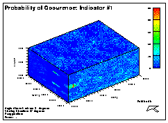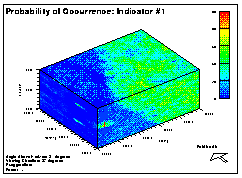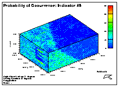 From the maps, it can be seen that the single zone realizations do not identify any transition of indicator frequencies accross the site. The distributions are relatively constant. With the two zone realizations, though, there are very distinct differences. Because there is such a high frequency of indicator #1 in the Lyons formation, most cells have a relatively high probability of being indicator #1. For indicator #5, which was quite rare in the Lyons Formation, its probability of occurrence is also low.