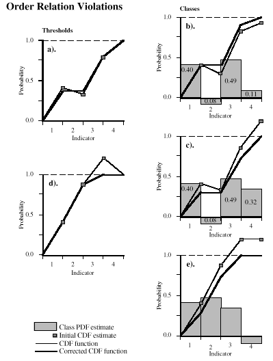 One type of ORV occurs when the CDF declines from one threshold to the next (Figure 2a). A CDF is a cumulative probability, so a declining CDF is an impossibility. It is not possible to determine which threshold causes the problem, therefore to remedy the situation, the average of the two probabilities is assigned to both thresholds. For classes, the equivalent problem is an individual class having a negative probability of occurrence (Figure 2b: indicator #2), which is also an impossibility. In this case though, it is reasonable to assign that class a zero probability of occurrence. There is no reason to distribute the error to another unrelated indicator.